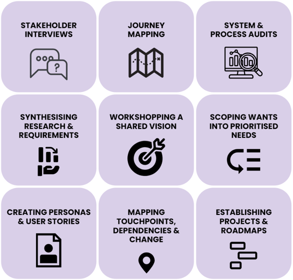 We guide discovery by supporting teams to make sense of scattered information and identify where gaps in knowledge, process, or expectations might impact the journey ahead through: